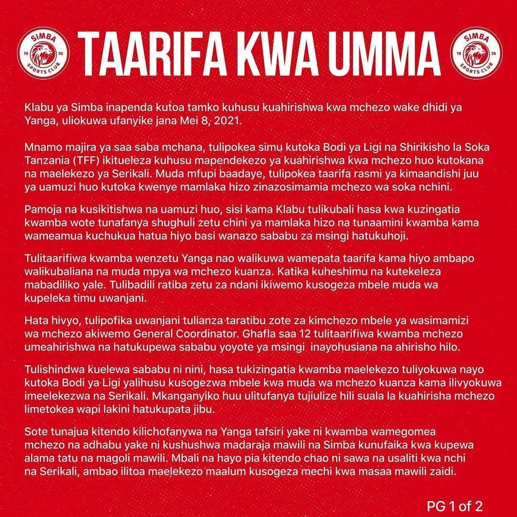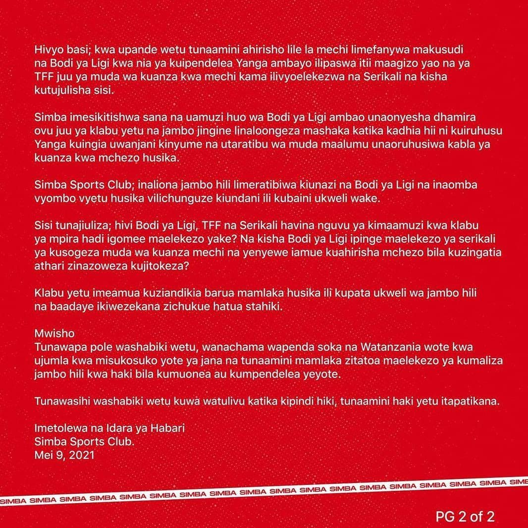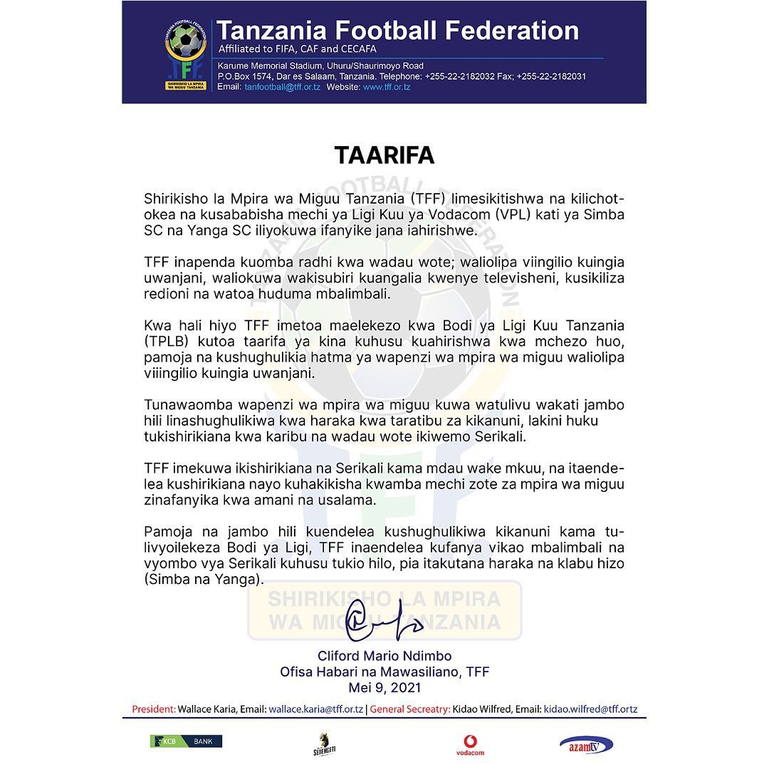 Katika waraka wake TFF uliopo katika kurasa zao za Instagram ,wamesema Wameiomba bodi ya ligi Kutoa Maelezo ya kina kuhusu sababu ya mechi hiyo kuahirishwa.