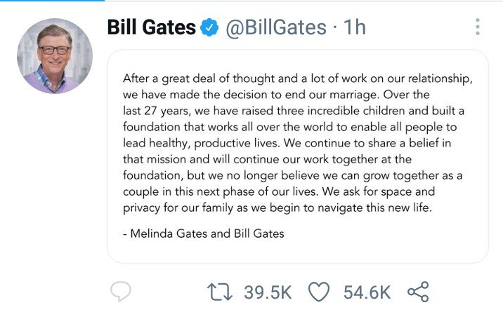 The 3rd ranking highest man with more Money in the world has confirmed on twitter that ,he breakup with his wife after 27 years ,the problem behind has not known clear but we still finding ……